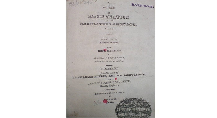 Early lithographed textbook from Bombay: A Course in Mathematics, 1828. English and Gujarati title pages