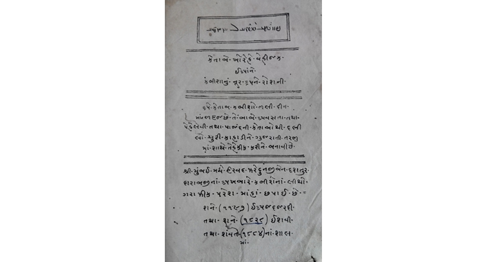 Beginnings of lithography in Mumbai at the Aukhbar Press: Gujarati titles. Kitab Korehe Vehejik, 1828