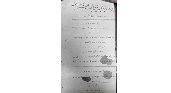 Beginnings of lithography in Mumbai at the Aukhbar Press: Gujarati titles. Shavehedul Nafisey fi isabattul kabisey, 1828