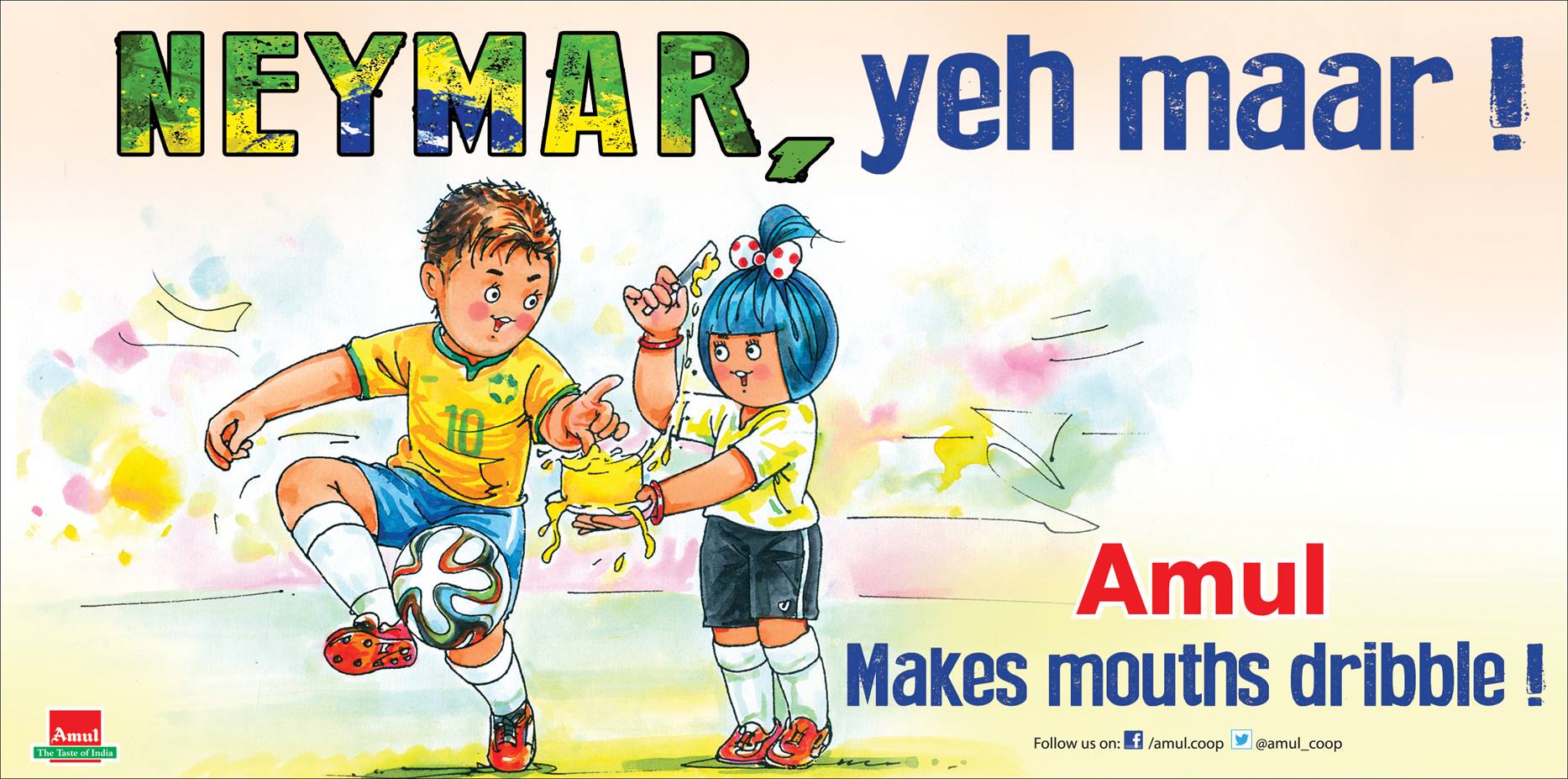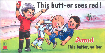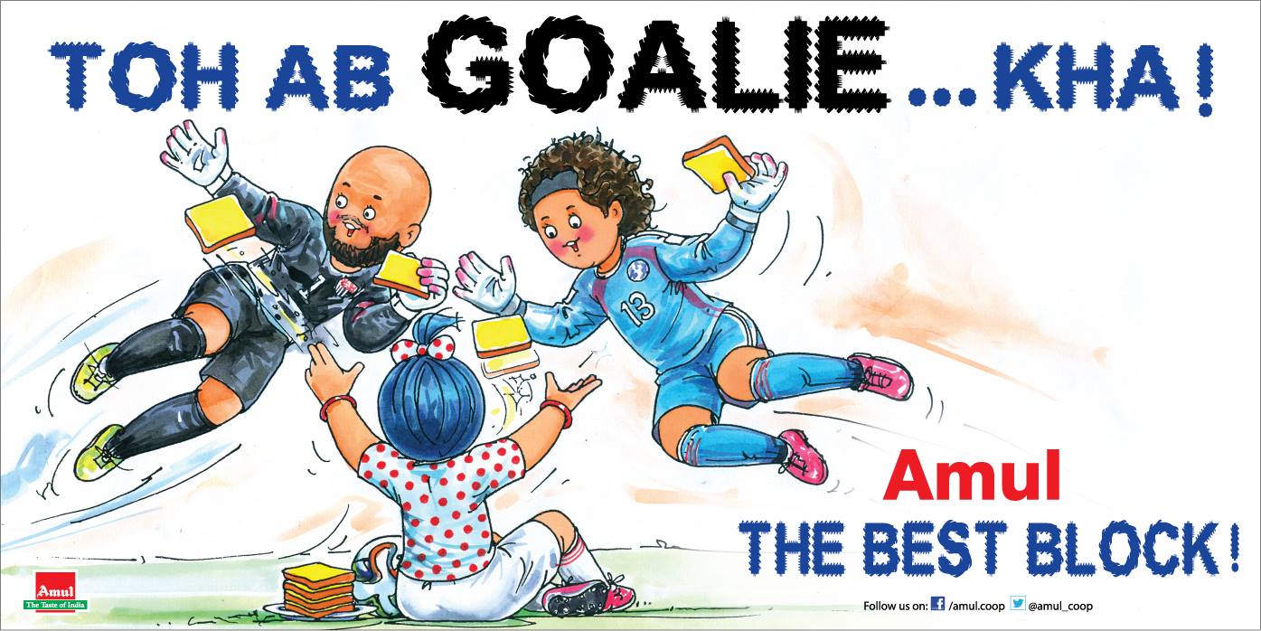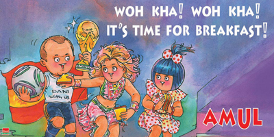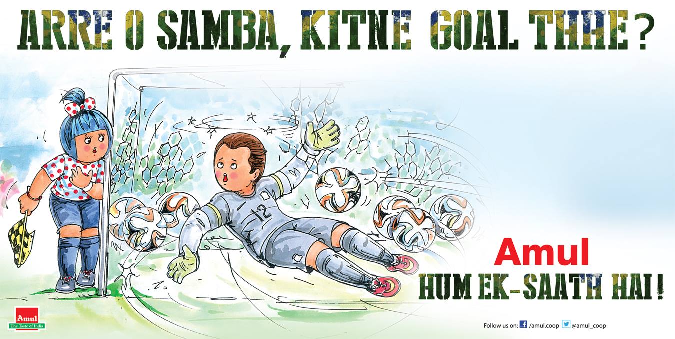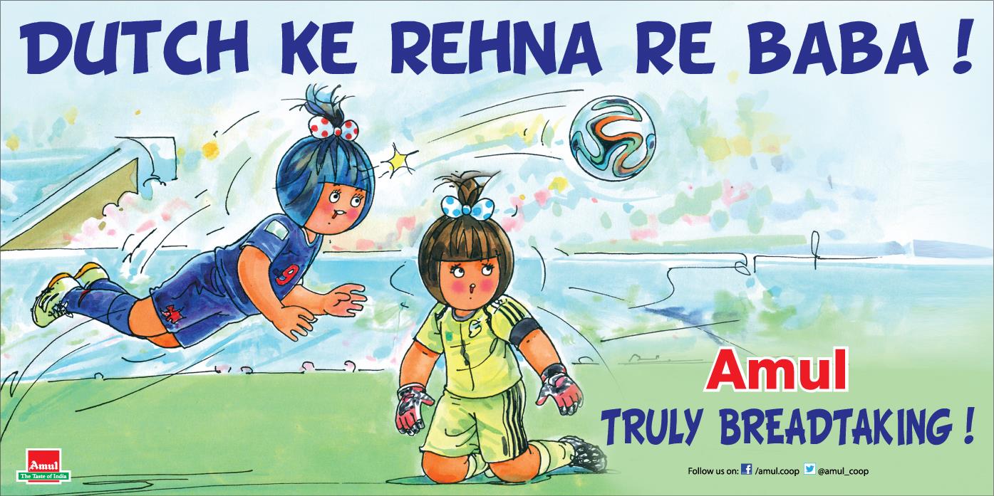Amul advertisements are iconic images of modern India. They more often than not are able to get the pulse of the nation with humourous puns on current events from all walks of life. “In principle my writer Manish Jhaveri and I who collaborate every morning, decide what is the key element of the FIFA we'd like to focus on every day. Say, yesterday's topical on the goalies. Or the previous day on Robben's fake dive. Manish then goes off and writes various optional lines looking at the issue