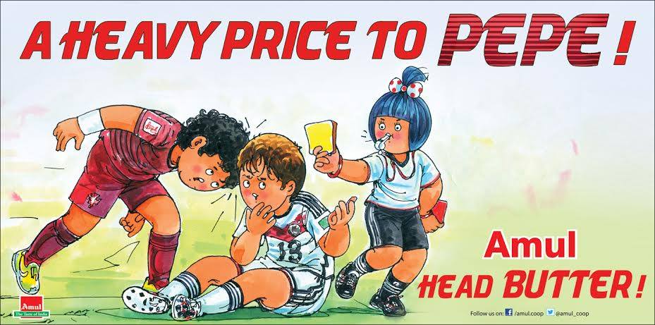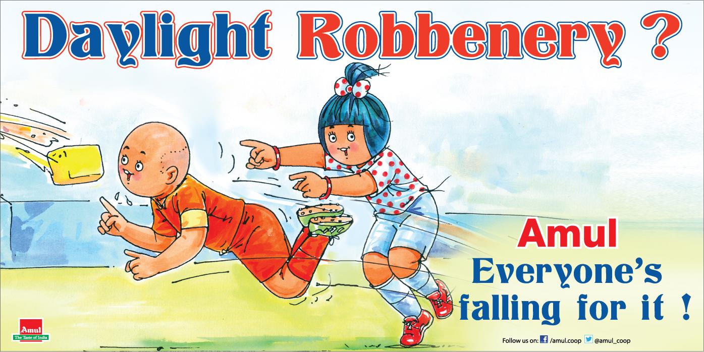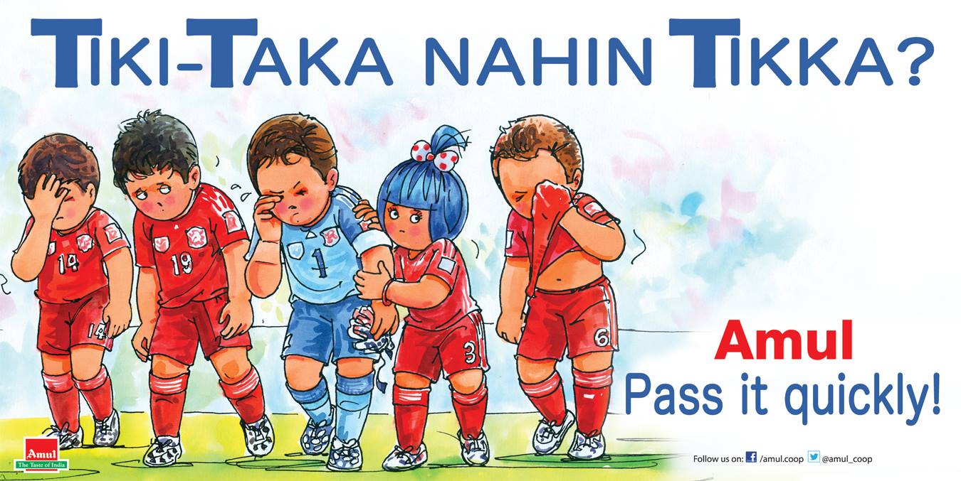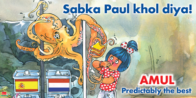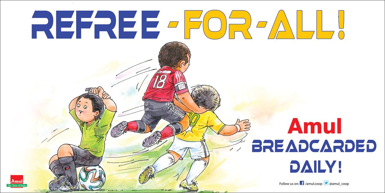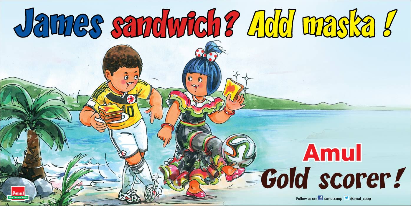 Amul advertisements are iconic images of modern India. They more often than not are able to get the pulse of the nation with humourous puns on current events from all walks of life. “In principle my writer Manish Jhaveri and I who collaborate every morning, decide what is the key element of the FIFA we'd like to focus on every day. Say, yesterday's topical on the goalies. Or the previous day on Robben's fake dive. Manish then goes off and writes various optional lines looking at the issue