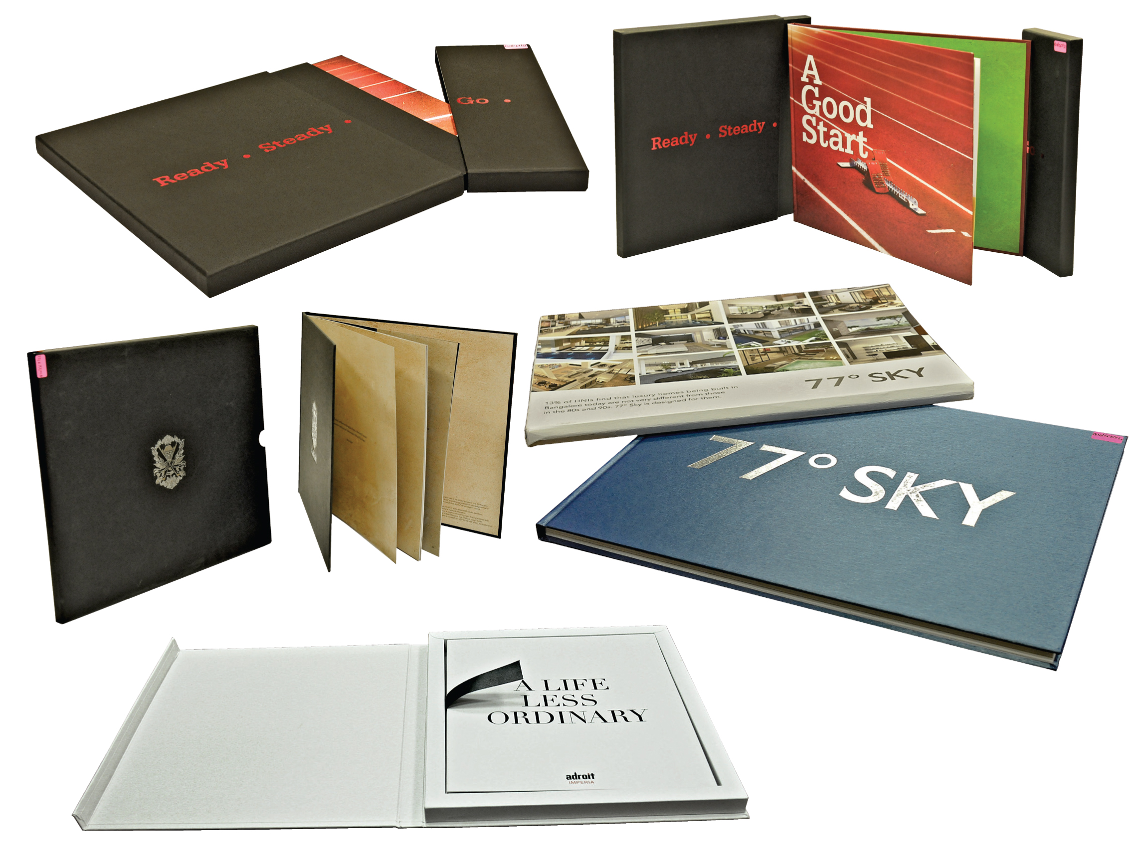 PrintWeek India Brochure Printer of the Year 2013 - Pragati Offset. All of which are four-colour jobs, Adroit Imperia and 77 Sky were printed on a Mitsubishi Diamond 3000 while the other two print job were printed on a Komori Lithrone 640 press. The Glade One brochure has velvet laminated outer hard case with highly intricate silver metal cut sticker