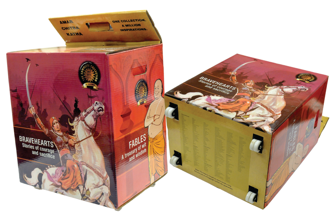 PrintWeek India Innovative Printer of the Year 2013 - Parksons Graphics. Parksons fabricated a box using four-ply double wall heavy duty corrugated, 300gsm three-M-duplex board, and printed the titles with illustrations (in four-colour) on the outer side of the box, with its Heidelberg XL 105. All the titles were placed in the box. Since the box was around 45kgs, four castor wheels were fitted to the box to make it mobile. The fabrication of box makes it a multi-purpose items. The lid of the box has been created in such a way that it can be pulled out and used as a handle for the trolley. The box can also be used as a chair and a table to write