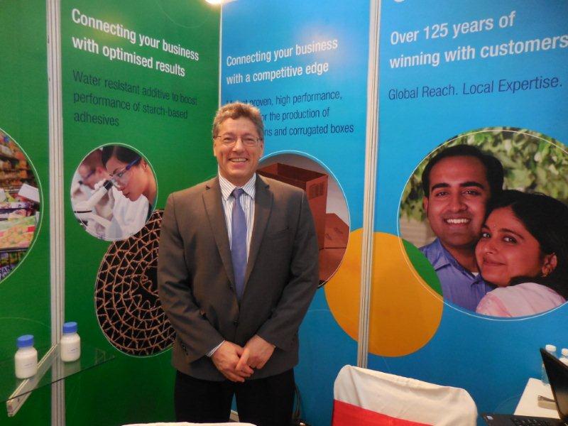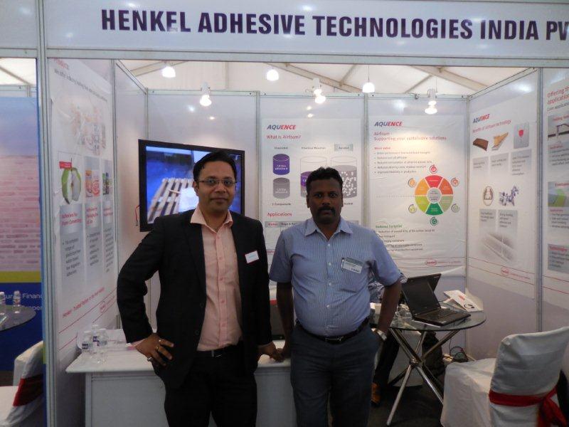 Henkel team. The company showcased Airfoam, Henkel’s trademark product, for the paper industry. It is a two component glue which foams when mixed together giving a number of benefits in terms of stronger bonding, quick setting, better lay-flat and fast drying. It is the best cost in use adhesive which will be available in the market