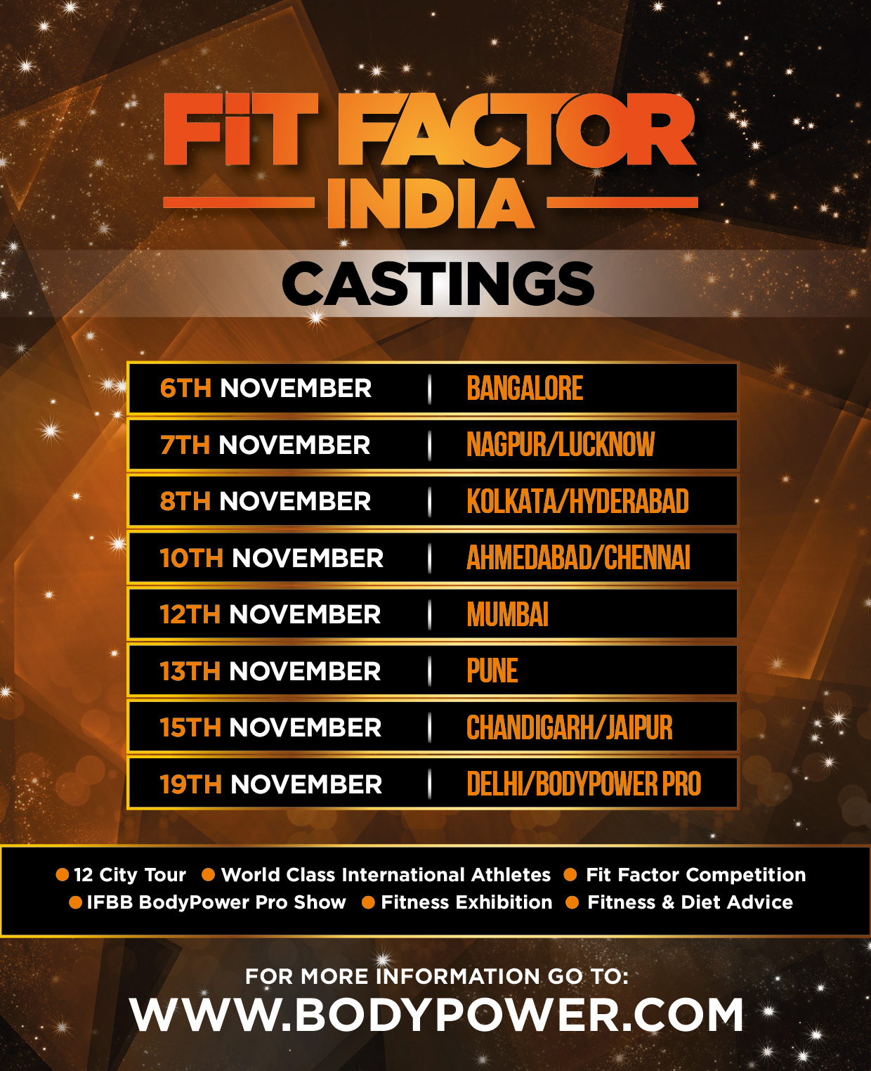 It is conducted in 12 cities in India.All national and international athletes are part of this seminar also if you are a fitness enthusiast you can participate in fit factor audition.If you get through auditions you can compete in the finals - BodyPower Expo that is on 6th January till 8th January.