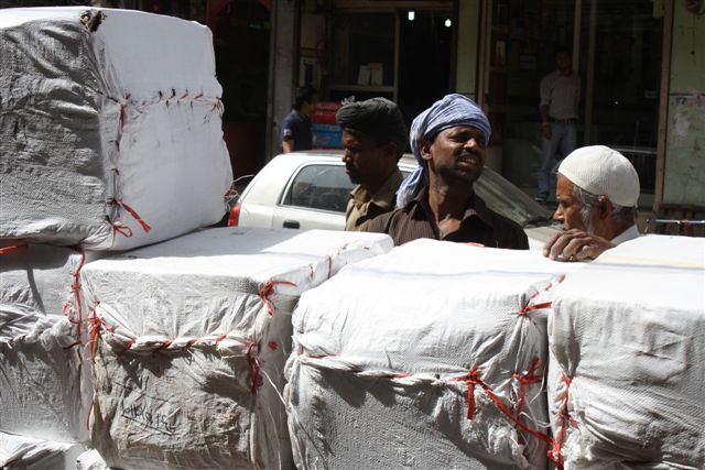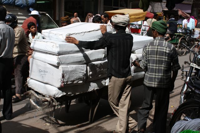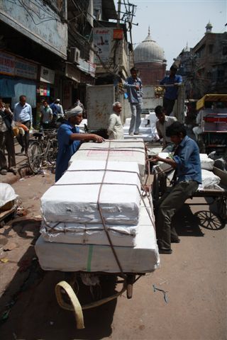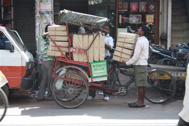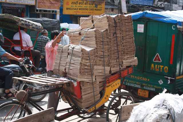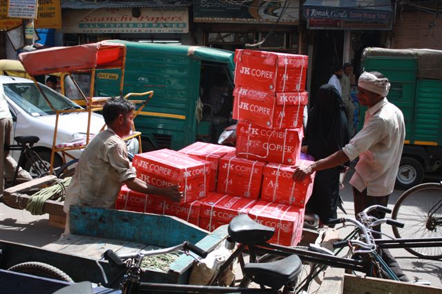 The paper market serves wholesale and retail customers. One such retail customers is arranging his stock on a hand rickshaw after having struck a good bargain