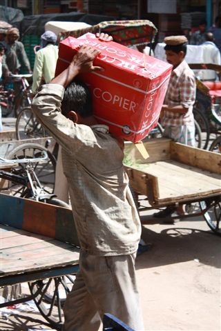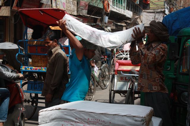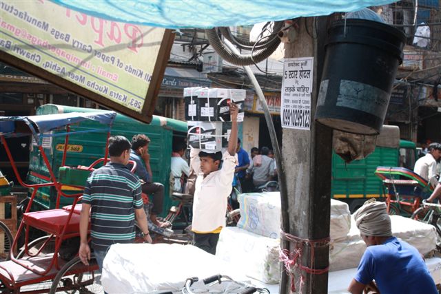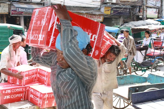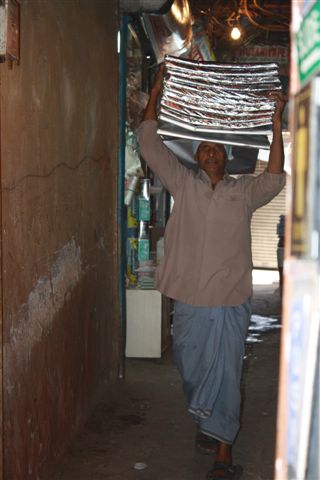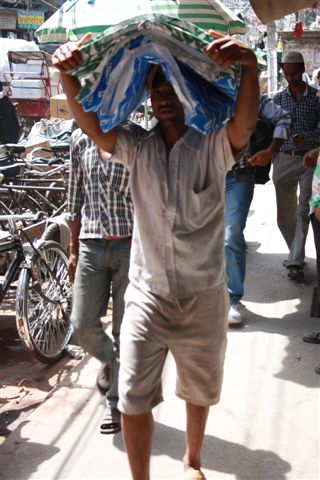 Paper delivery boy loads a bundle of paper on his head. Chawri Bazaar is a road which has Jama Masjid at one end and Hauz Quazi on the other end of this lane