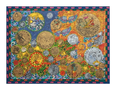 MARVEL ART GALLERY, Ahmedabad | Vishwaroop, Chapter 11, Verse 20 Metal: Bronze in Fine Art Reproduction categoryThe Process: This serigraph on paper from Marvel is a narrative of the Bhagwad Gita The layer upon layer evidently shows a combination of flat colours, knife or brush strokes, and strokes of diluted colour or tones. According to Marvel, even the flat colours have been produced with layeringTech-specs: 125 editions of the serigraph were created in 60 days. There are over 72 tones of colours /screens. The paper used is 280gsm Magic Touch, Korea