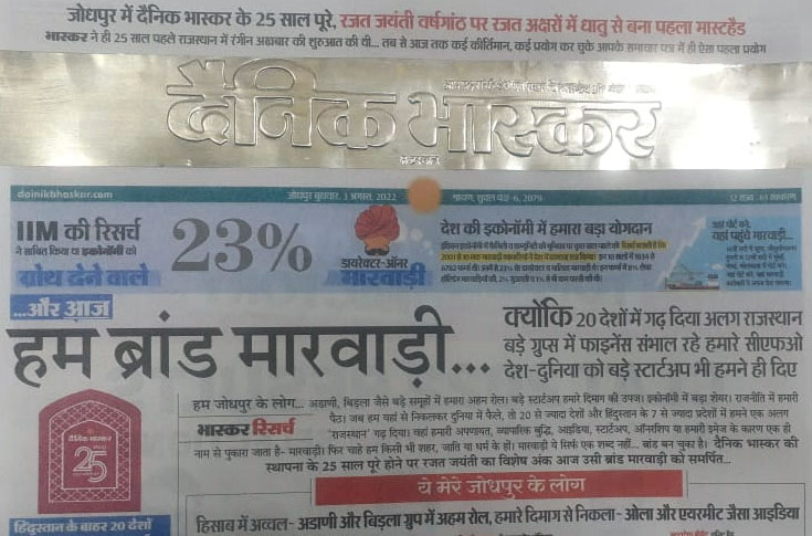 The 72-page Jodhpur silver jubilee edition created three world records. One, a 900-kg, 17-ft long and 4-ft high masthead that celebrates the handicraft legacy of the city. Two, A masthead that for the first time ever, used silver, to commemorate the twenty-five years of Dainik Bhaskar in Jodhpur. Three, a tribute to the well-known local cuisine by creating a world record of 10,000 people eating the famous Mirchibara at the same time in Ashok Udyan.