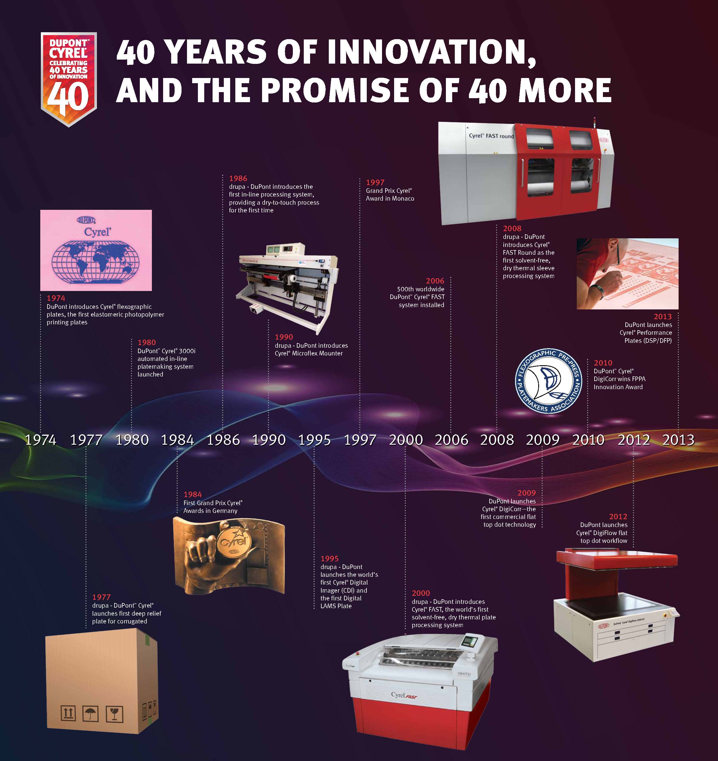 Dupont will mark the 40th anniversary of Cyrel with a year-long global celebration highlighting historical milestones, as well as past, present and future leaders in innovation with Cyrel flexographic printing systems.