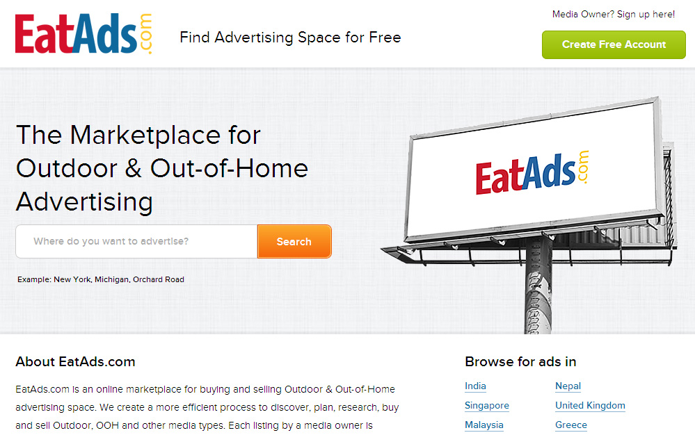 EatAds.com is an online platform that facilitates the search and discovery of outdoor and OOH advertising space for media buying agencies, public companies and SME’s around the world. It is a free-to-list, no commission, free subscription service for media owners anywhere in the world.