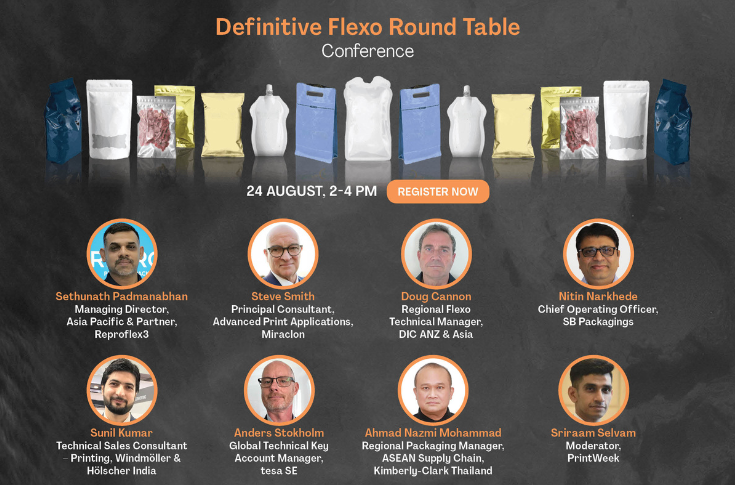 The eight panelists include: Steve Smith, the principal consultant, Advanced Print Applications at Miraclon; Anders Stokholm, the global technical key account manager at tesa SE; Doug Cannon, the regional flexo technical manager at DIC ANZ & ASIA; Sunil Kumar, technical sales consultant – printing at Windmoller & Holscher; Nitin Narkhede, the chief operating officer at SB Packagings; Sethunath Padmanabhan, the managing director – Asia Pacific and Partner at Reproflex3; and Ahmad Nazmi Mohammad, the regional packaging manager, ASEAN Supply Chain at Kimberly-Clark Thailand. The session will be moderated by Sriraam Selvam of PrintWeek and WhatPackaging? magazines.