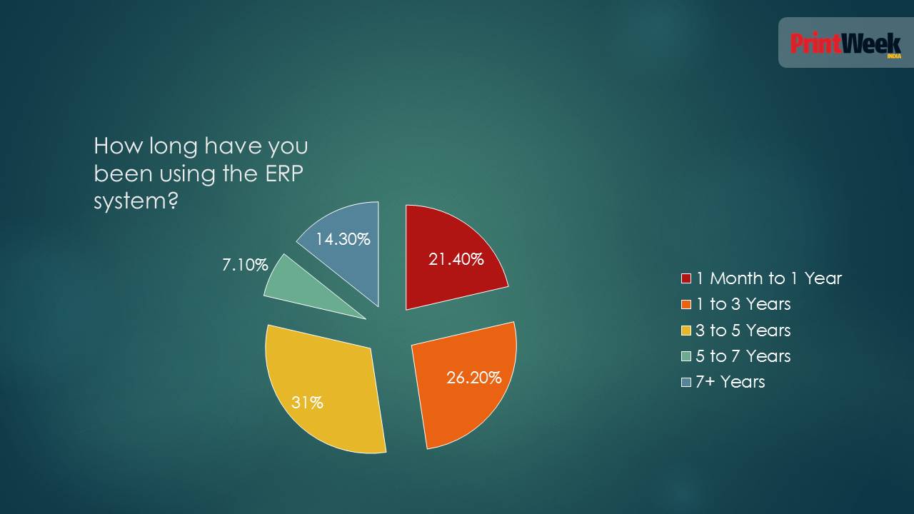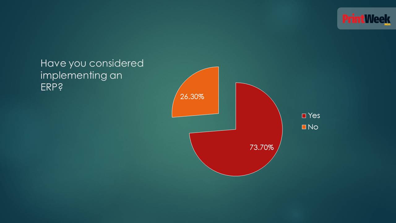 Of the non-users, 73.70% have considered implementing ERP. According to PrintWeek India's managing editor, Noel D'Cunha, the proactive participation of the non-users in the survey is a good indication. "This is a true indication of the industry's adoption levels. The interest shown in future implementation is an encouraging sign that they are ready to engage in a dialogue and gain insight before taking the plunge."
