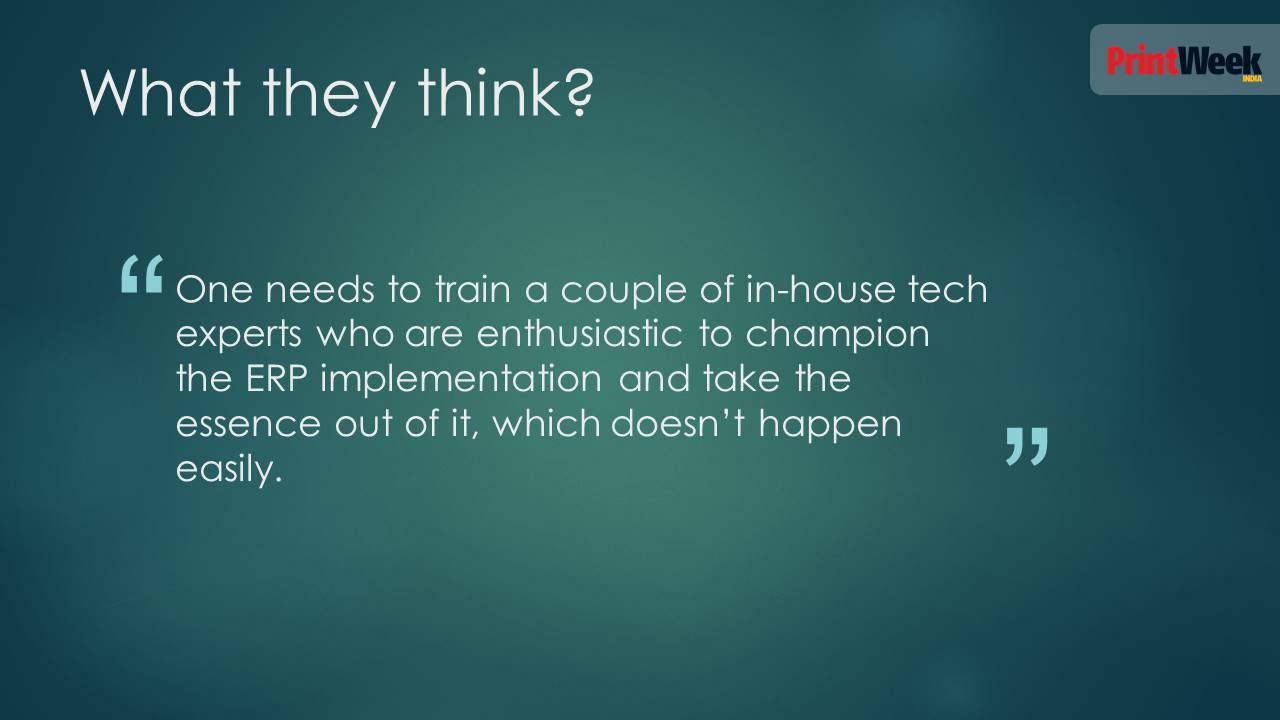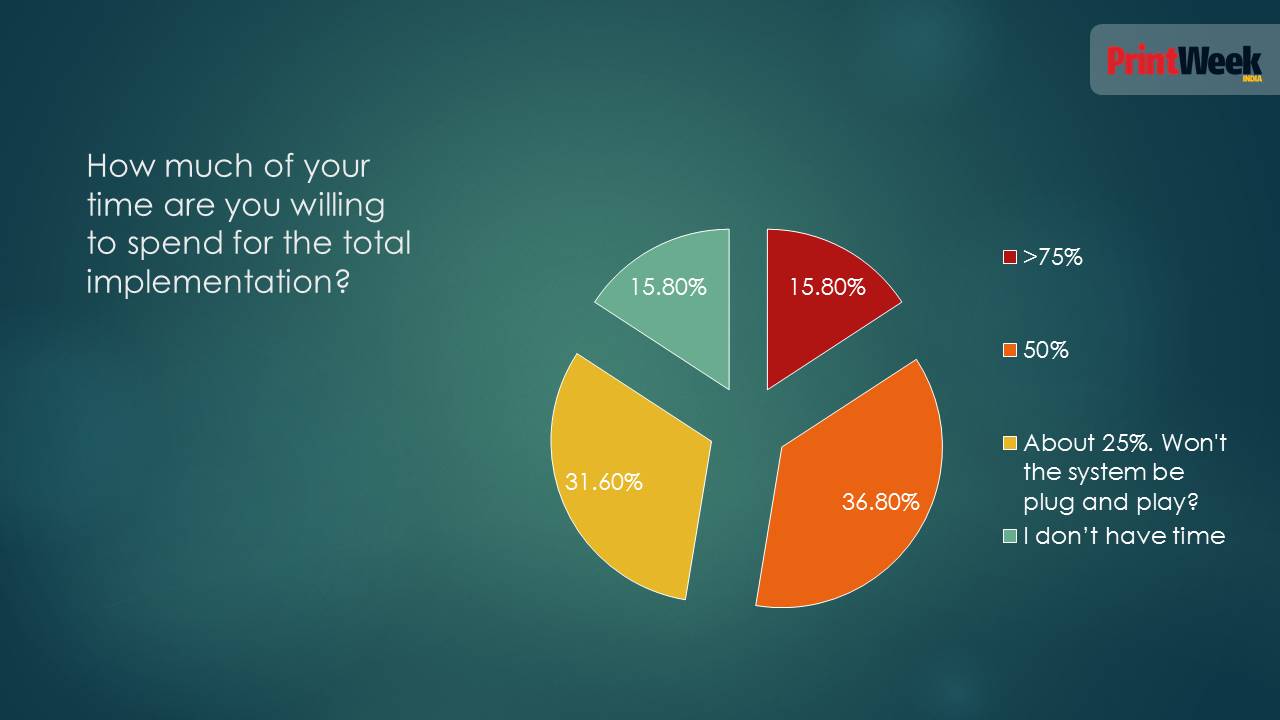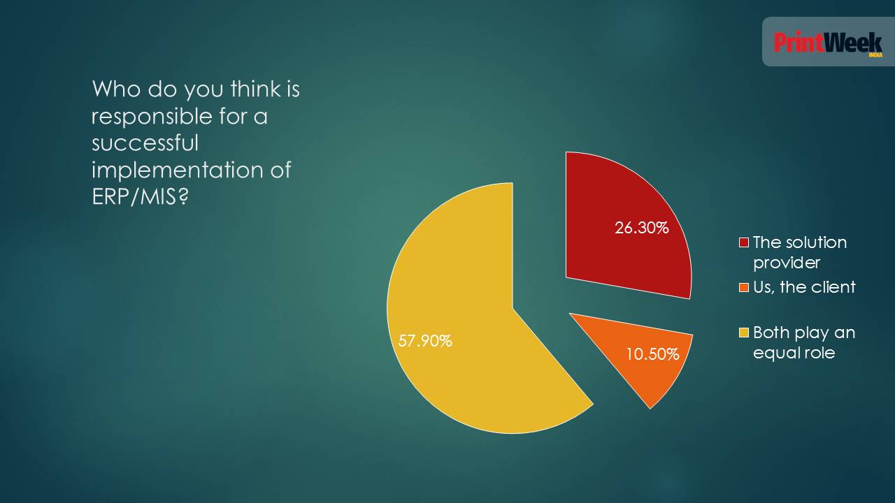 With a slender 11% believes that the print company is responsible for the success of the implementation, Narendra Paruchuri of Pragati Offset shares, "Getting our own team which is conversant with our business to drive the implementation is extremely important for its success."