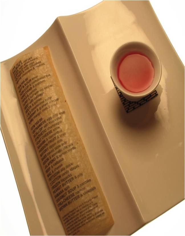 A chef, Homaro Cantu invented edible paper. The sausage in the picture is printed food, produced by using inkjet printer. Also, the paper where menu is printed is edible.