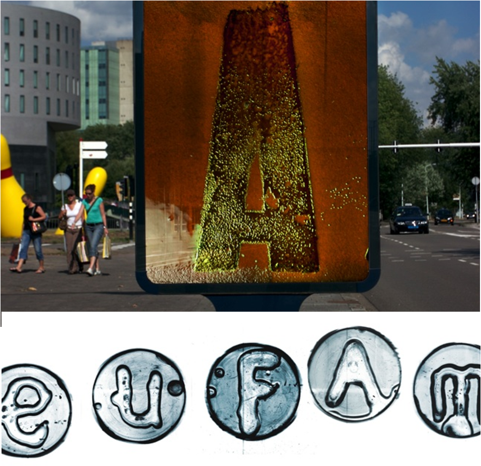 A project named Symbiosis by Jelte van Abbema wherein bacteria are injected in advertising board. The bacteria germinates and the colour of the board changes everyday. He also created the bacteria font.