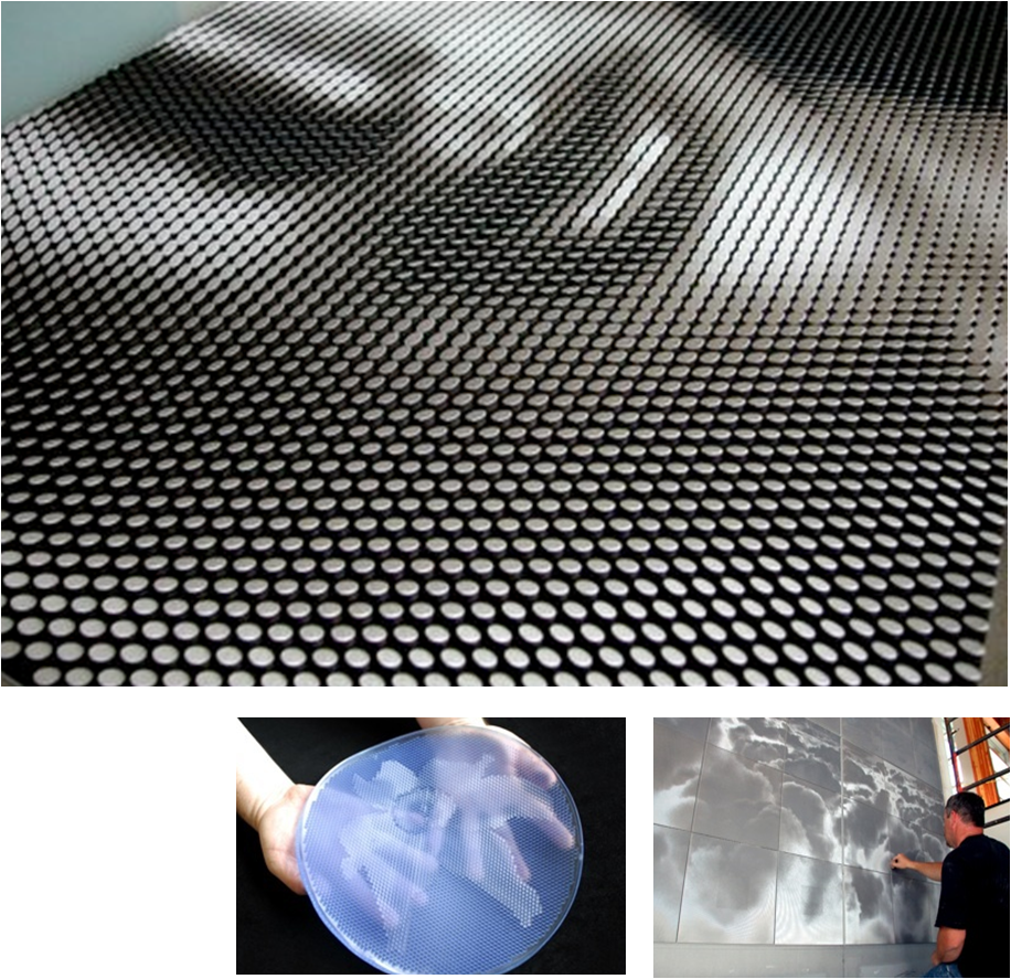 With Qmass's Ombrae (shadow) system, an image is translated onto an array of optical tiles. Each optical tile is a beveled, cylindrical "pixel" with an angled surface that reflects a particular, precisely determined amount of light. This array of optical tiles literally sculpts the reflected light into an image.
