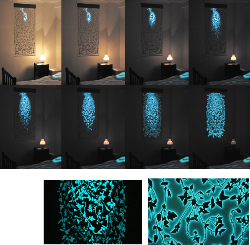 Designed by Rachel Wingfield, Digital Dawn is a luminous textile that responds to environmental stimuli. Digital Dawn functions as a traditional window blind with a reactive surface growing in luminosity in response to its surroundings.