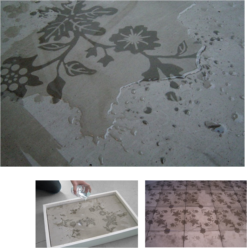 Solid Poetry is a concrete tile that reacts on water. It's a symbiosis between concrete and water. As the water flows onto the concrete tile, images or patterns will appear.