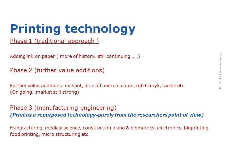 During an elaborate presentation on 8 November at Print Fair, Prof Dr Rajendrakumar Anayath looks at how change is the only constant. He observes how materials and technologies are repurposed to make profitable businesses around the world and explains the future of printing as a repurposed technology.
