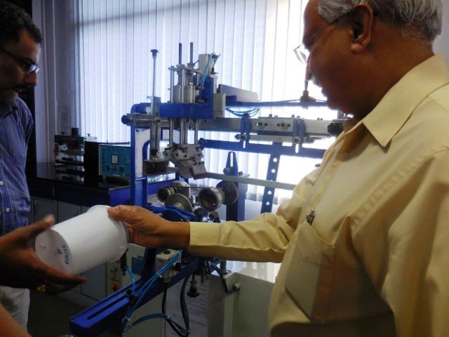 The Newtech machine, especially designed to print on rigid surfaces. Subramanyam demonstrating its operation on a circular container