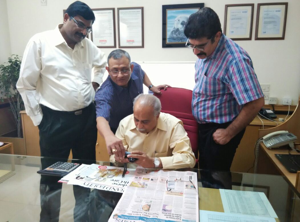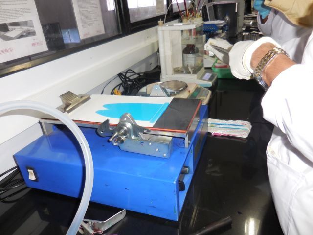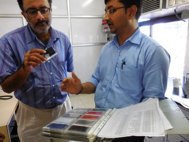 Every batch undergoes a quality check to ensure that the required standards are met. Here, a lab personnel checking the uniformity of ink on spreading on the substrate