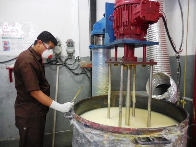 Here, all the raw materials are mixed and stirred together. All four process colours - CMYK - are formulated separately