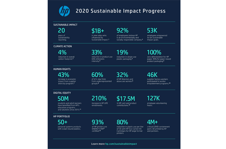 HP has remained steadfast in its commitment to accountability and transparency since the company published its first environmental and social impact report in 2001. In this year’s Sustainable Impact Report, HP outlined the progress made in 2020 as well as improvements still needed – below are highlights and the full report executive summary can be found here.