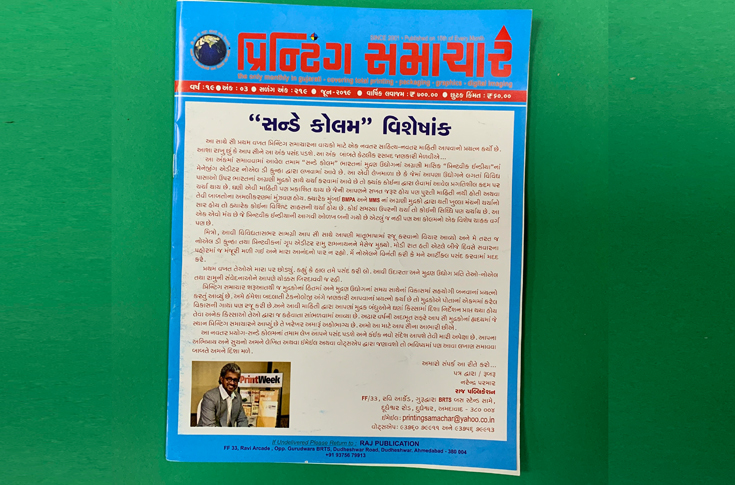 The Noel D’Cuha Sunday Column – extends its roots in the city of Gujarat – featured in Gujarat’s only magazine for print, Printing Samachar