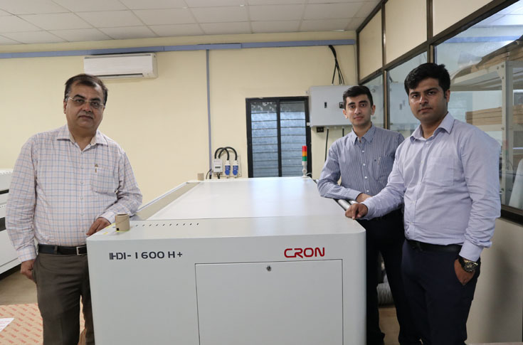 Jatin Udeshi (l) with his son Harsh (r) and Akshat Pardiwala of Nippon Color, with India’s second Cron HDI-1600H+ kit