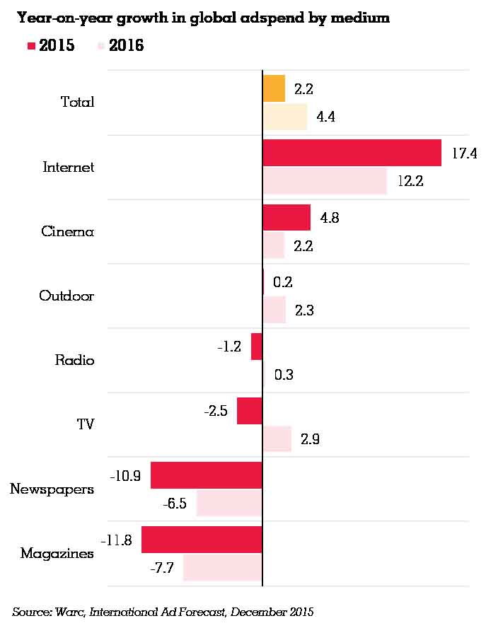 Across all key markets, internet adspend will continue to register rapid growth, rising 17.4% and 12.2% this year and next. Conversely, advertising expenditure for TV is estimated to have fallen by 2.5% this year, although these losses will be negated be a forecast 2.9% rise in 2016.