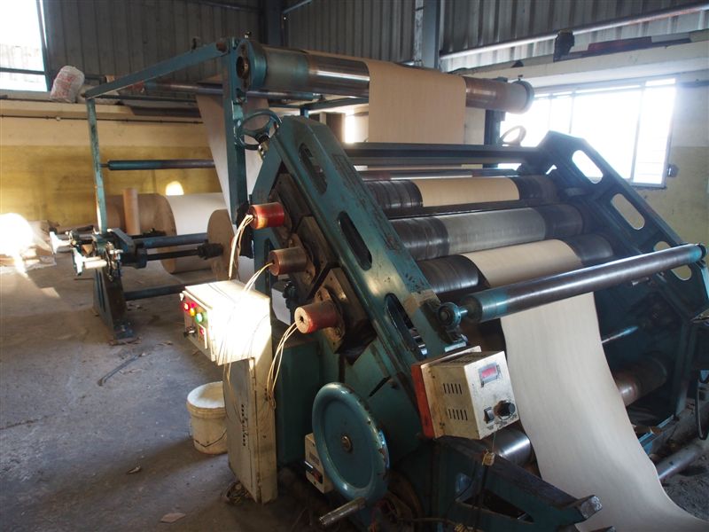Pasting machine for three-ply corrugated sheets. This is where the two-ply sheets/liners gets converted into a three-ply corrugated sheet