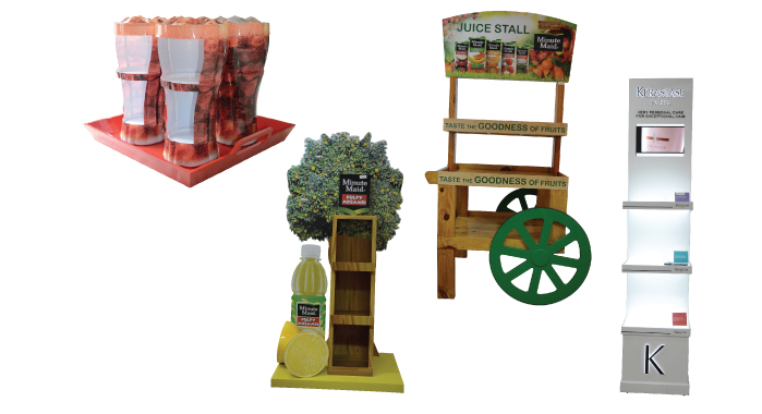 The Minute Maid Pulpy Mosambi FSU for Coca-Cola India has a run length of 52. Spectrum designs the unit showcasing a mosambi tree with images of fruits and dispensers for bottles. The base, resembling a tree-trunk, can hold 21 bottles. This job, too, is printed on HP Latex with green ink. The main unit is made using MDF (medium-density fibreboard) with digitally printed self-adhesive vinyl mounted on it. The fruit pieces are thermoformed. Special features include wood cutting, metal cutting and powder coating and thermoforming.