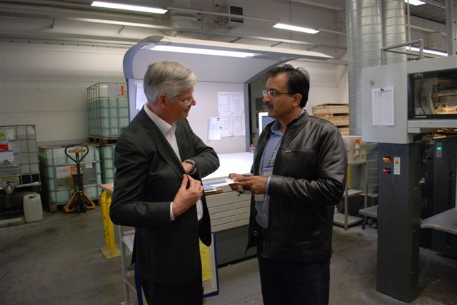Jörn Kalbhenn, owner, B&K Offsetdruck confabulates on pressroom best practices with Faheem Agboatwala of Hi-Tech Printing Services