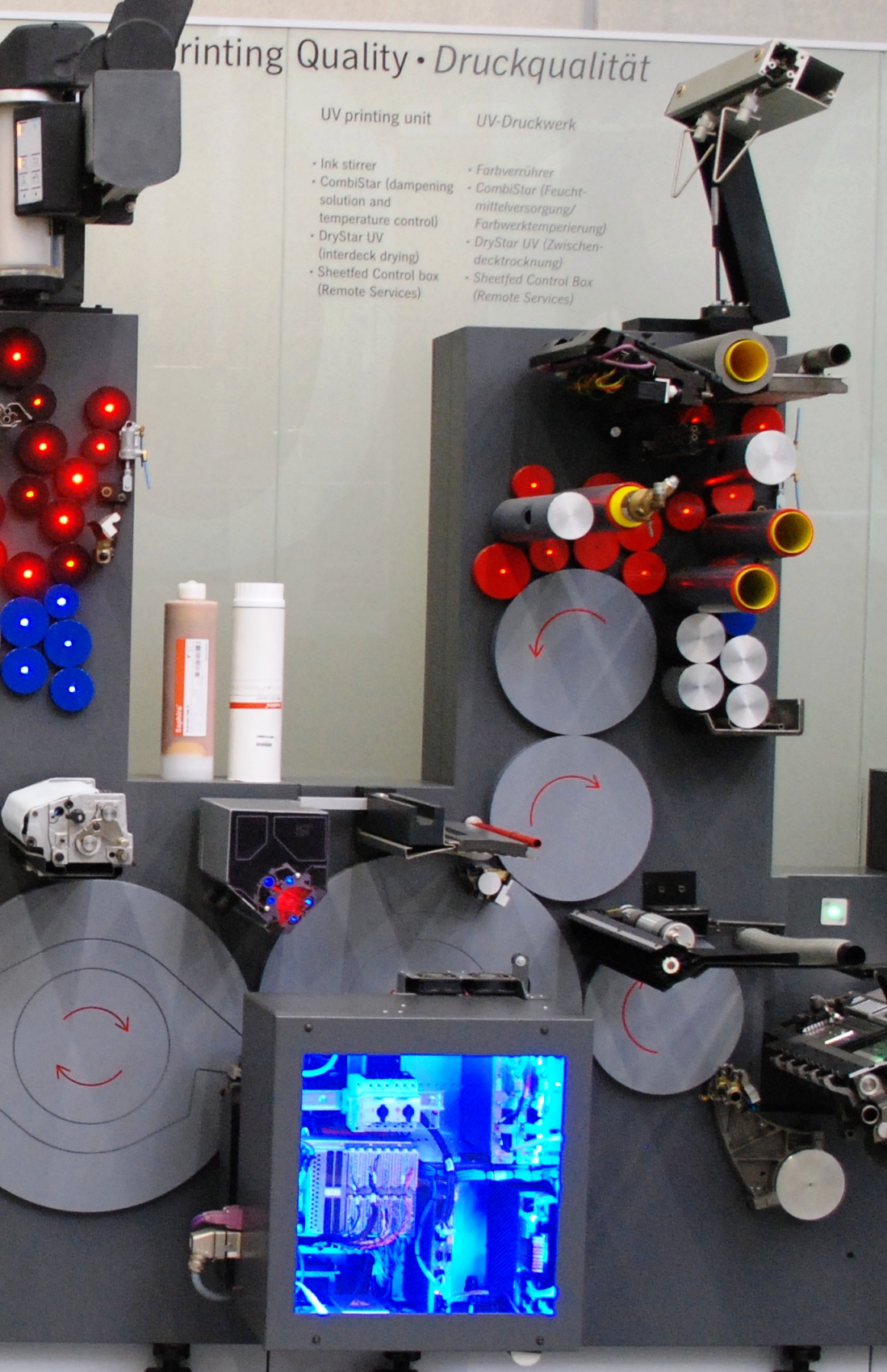 In the picture is a TS view of UV printing unit. It boasts of ink stirrer, CombiStar dampening solution and temperature control system, Drystar interdeck UV drying system and sheetfed control box