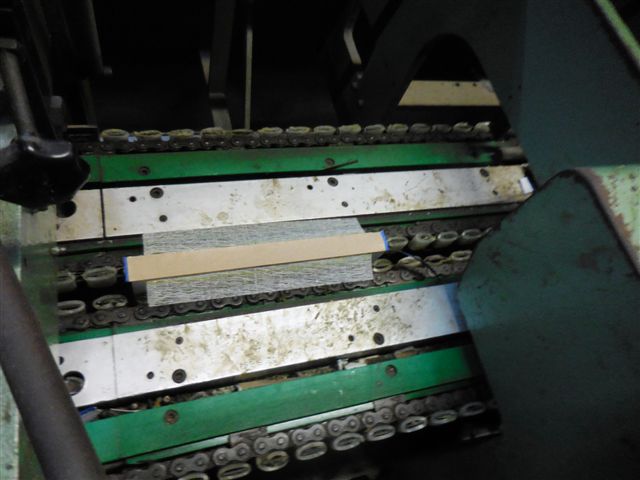 The glued books travel to the three-knife trimmer via a conveyor belt