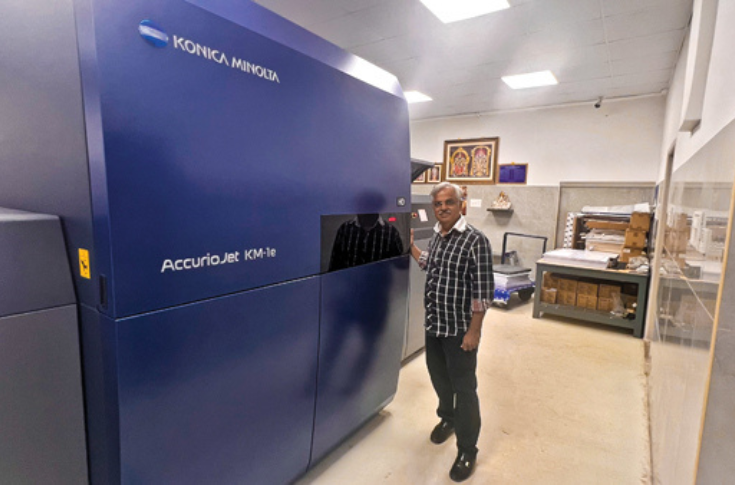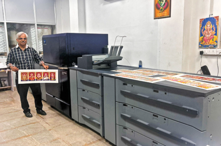 Digitisation began in 1997. An Agfa imagesetter and Creo CTP put JB Khanna Pictures among India’s earliest adopters. By 2000, tens of thousands of images had been digitised. Variable formats, instant edits, and reduced wastage became possible. “Even newspapers weren’t this fast back then,” Khanna quips. Investments followed: a Konica Minolta C6100 in 2014, India’s first AccurioJet KM-1e in 2022, and a C14000 in May 2025, the first C14000 in South India. These presses offered not just speed, but colour fidelity essential for devotional work. “You can’t get Krishna’s skin tone wrong,” he says. With high DPI, and the ability to print on metallic films and synthetic stocks, digital offered flexibility offset couldn’t. Digital didn’t replace offset—it complemented it. Large festivals still demand volume, where offset delivers. But short runs, custom orders, or on-demand images? That’s digital territory.