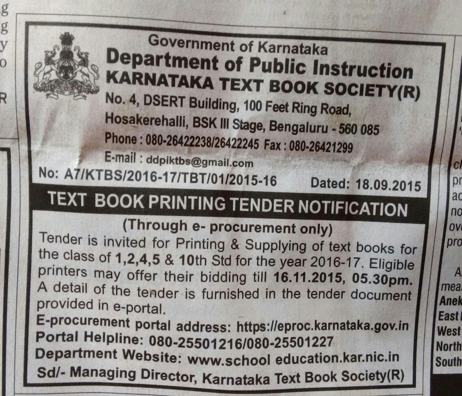 For more details regarding tender, the printers can contact Government of Karnataka, Department of Public Instruction Karnataka Text Book Society (R), No. 4, DSERT Building, 100 Feet Ring Road, Hosakerehalli, BSK III Stage, Bengaluru: 560085, Phone: 080 26422238/26422245, email: ddpiktbs@gmail.com