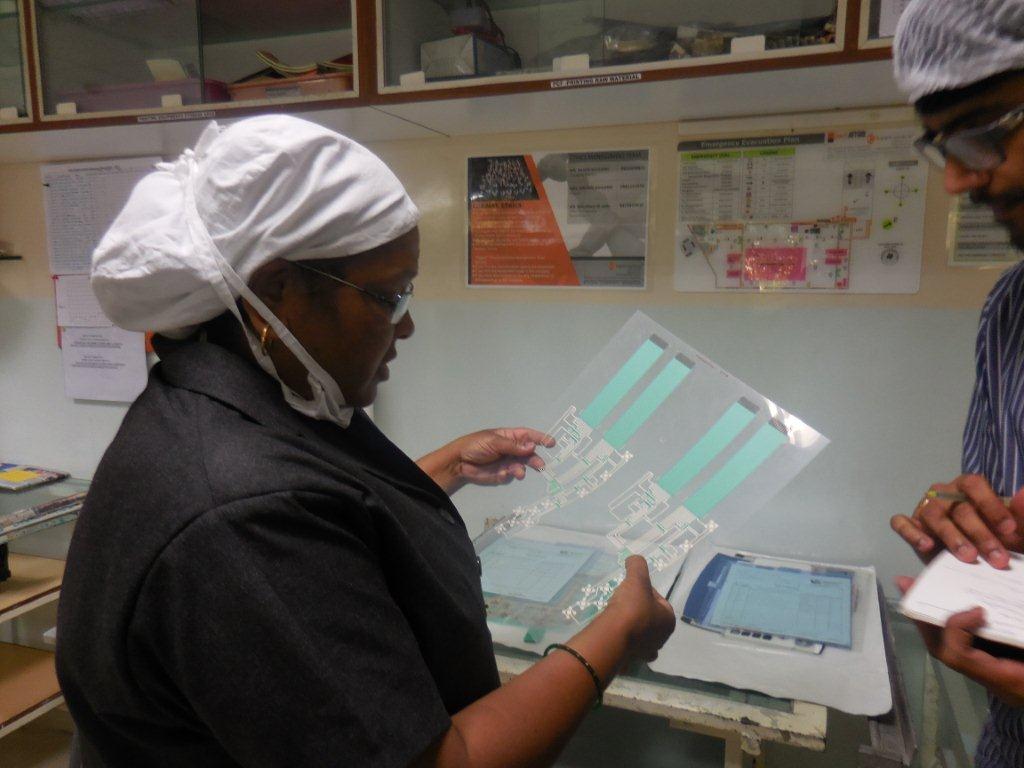 Vasumati Thopte (l), printing in charge at Keetronics explains the screen printed components a job in progress. These components includedie-electric components, circuits, transistors, resistors etc.