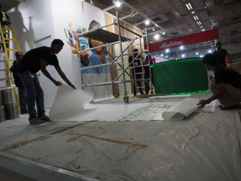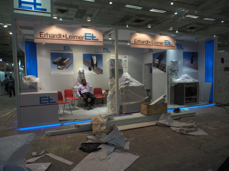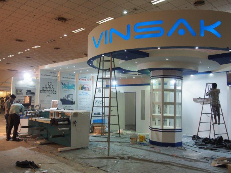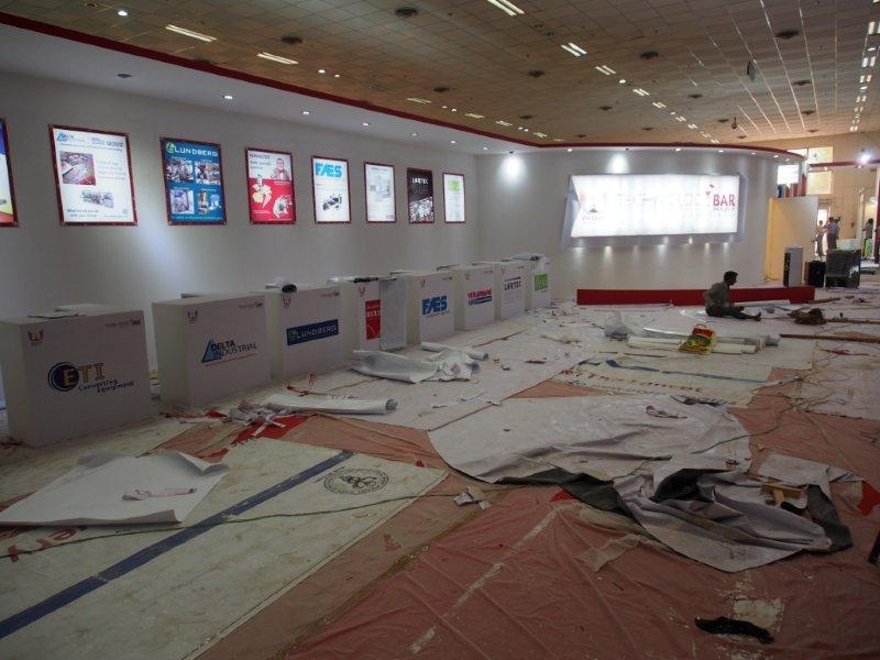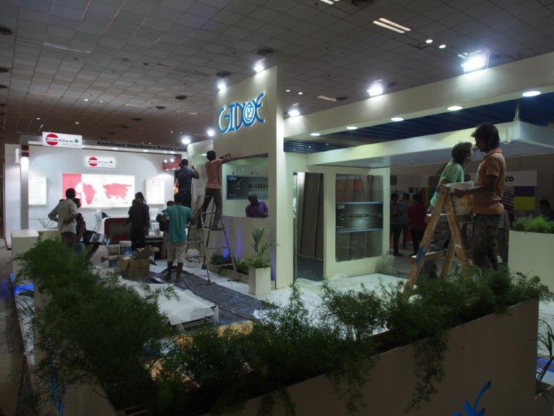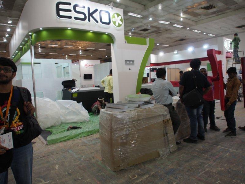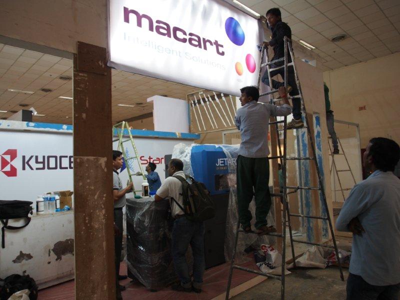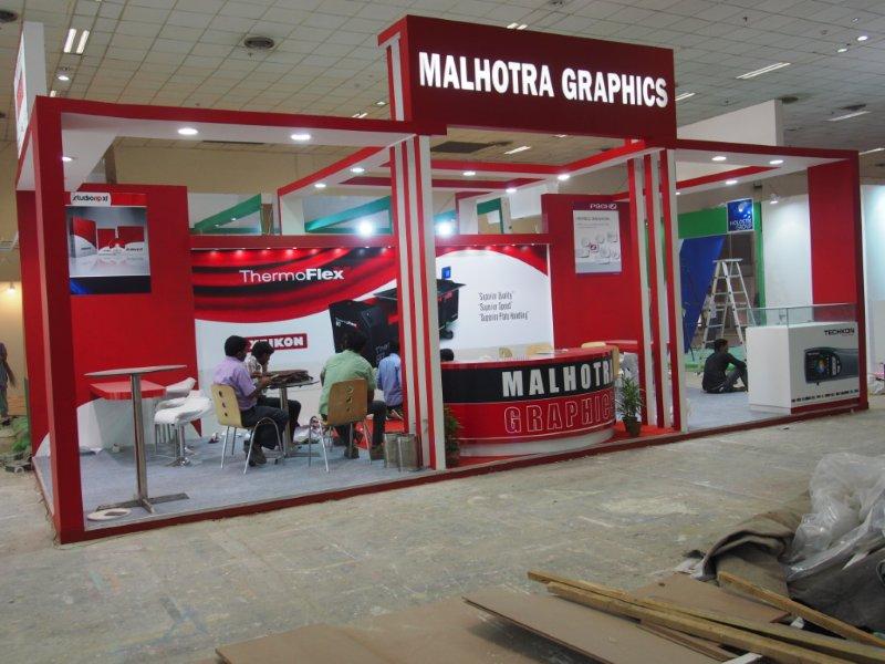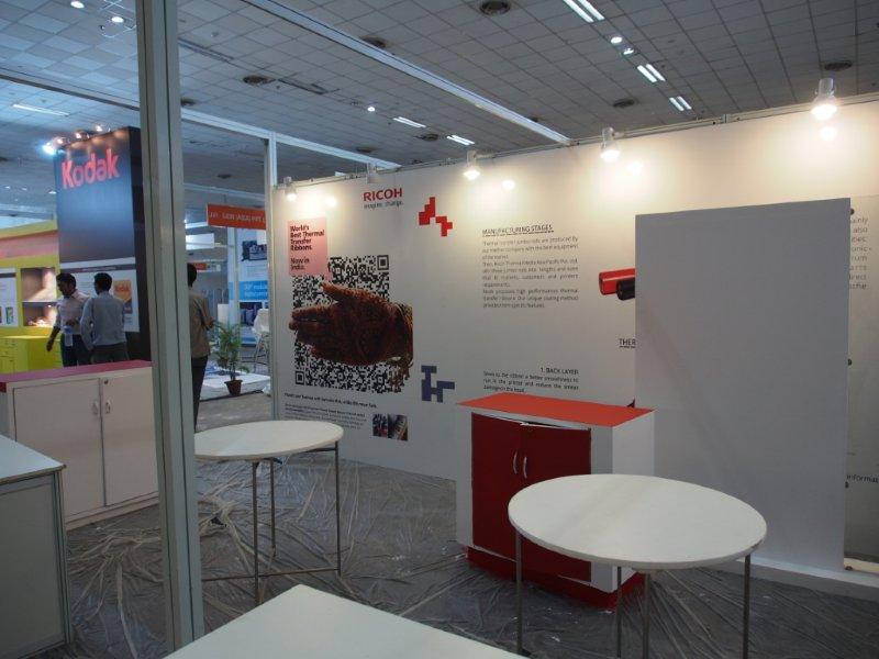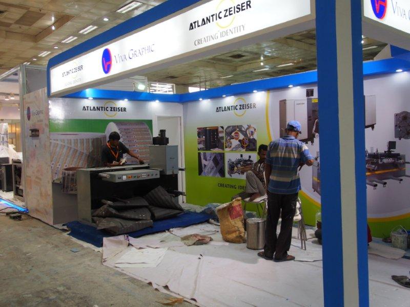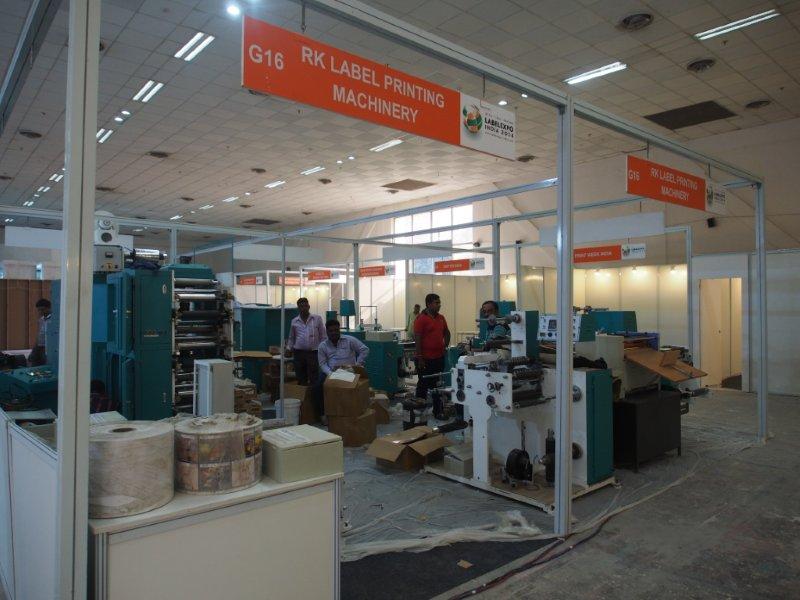 Malhotra Graphics' stall in their customary red being readied for the show. The Mumbai-based firm represents various overseas manufacturers.