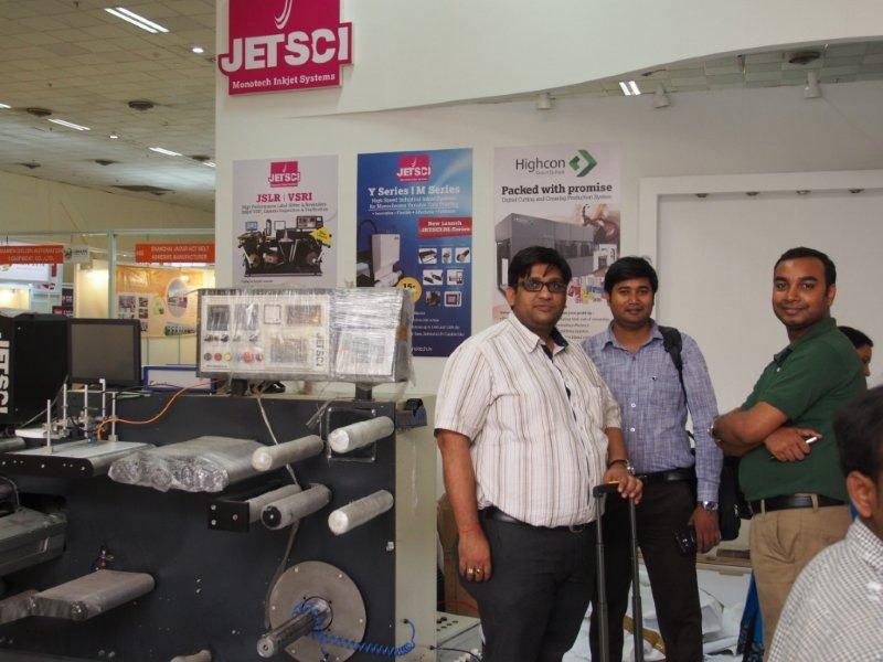 Akash Kumar(r) and the Monotech team with the Jetsci industrial inkjet system for monochrome variable data printing.