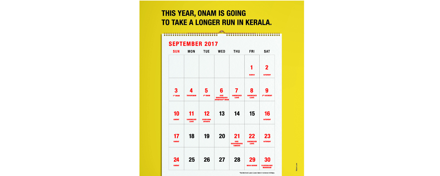 The creative of the campaign is in form of a calendar format with September 2017 month which highlights all the major holidays and sandwiched leaves which people would opt for in Kerala. The campaign will be communicated via print ads and online promotions in trade media.