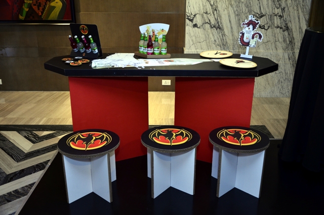 Table, stools, bottle stands and trays, all manufactured with corrugated sheets and printed digitally