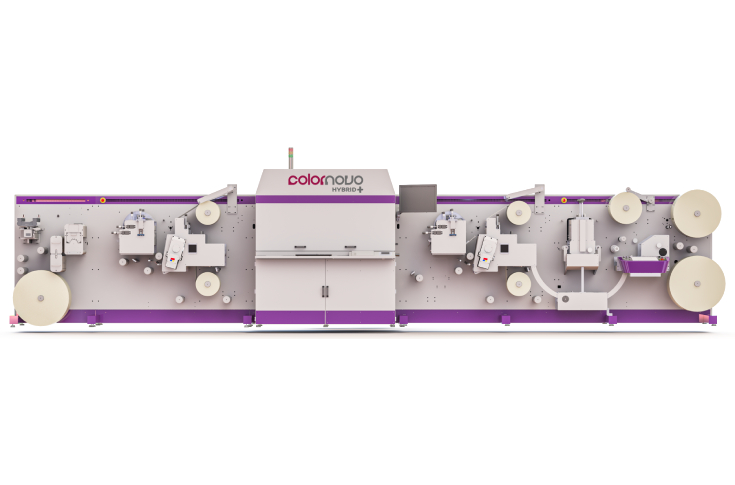 Jetsci Colornovo Hybrid+: This model is suitably configured digital label production press having additional finishing and converting features to Colornovo Hybrid, flexo station with cold foil after UV inkjet, semi & full rotary die-cut, slitting station and dual rewind.