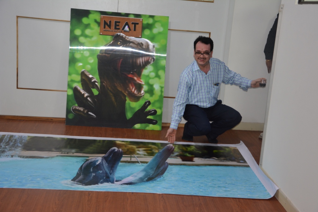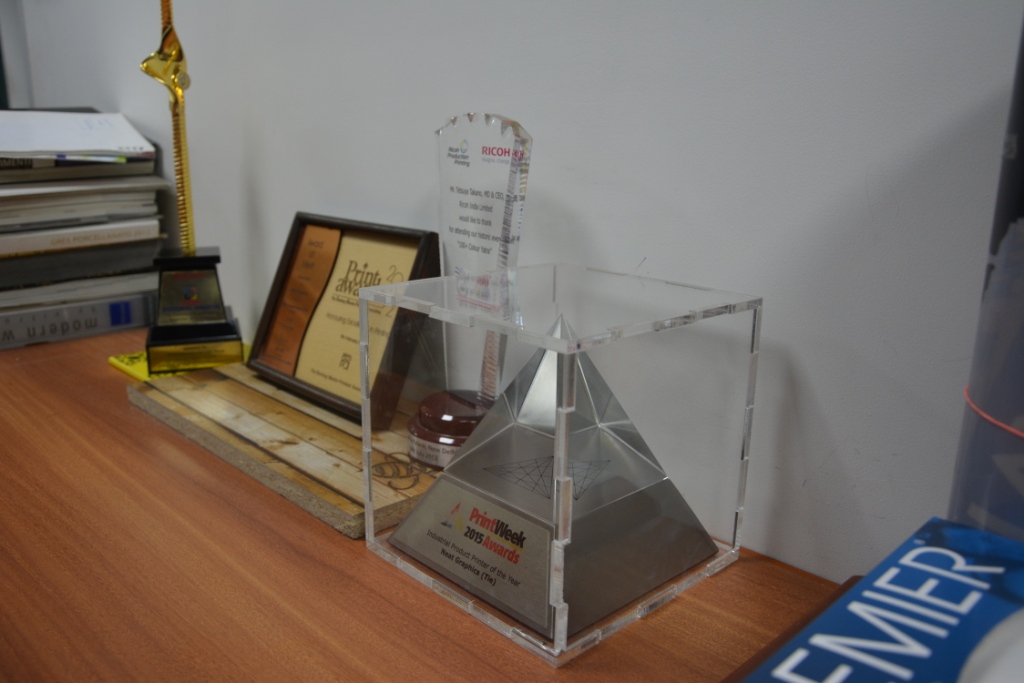 The most recent award in Neat's bag is jointly held PrintWeek India Industrial Product Printer of the Year 2015 title for four stunning posters of Drishyam in different sizes, Elevation in 3D for an architect firm, and Mahindra Gusto scooter with a car-like feature