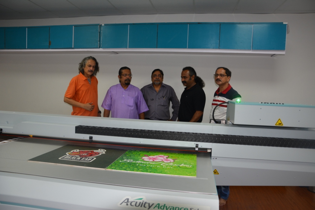 The Acuity Advance can handle a maximum thickness of 50.8mm in rigid media with image quality equivalent to 1,200dpi resolution or higher. In the picture, Hitesh Shah of BBDO India, takes a closer look at a print on ceramic