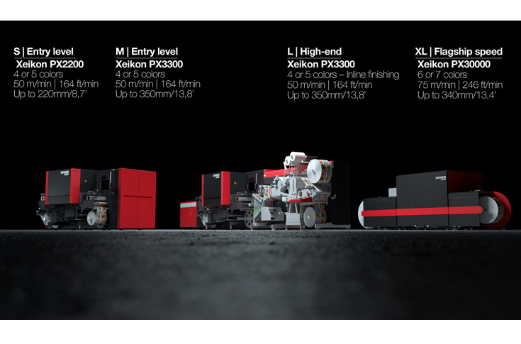 With the addition of two new presses, the Panther 2.0 series now comprises of seven different UV inkjet press. This includes the Xeikon PX30000, available with 6 (CMYKOV) or 8 (CMYKOV+WW) print stations. It will now be accompanied by the Xeikon PX2200, 220mm wide, available with 4 or 5 print stations, and the Xeikon PX3300, 330mm, available in four and five print stations or HC-high capacity.