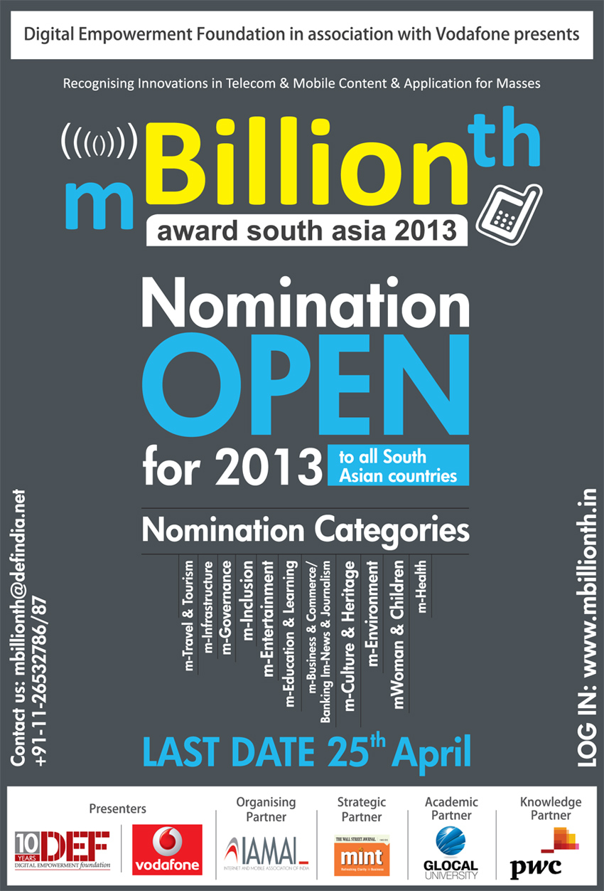 To find more info on nomination, please visit http://mbillionth.in/event-2013/nomination-form-2013/