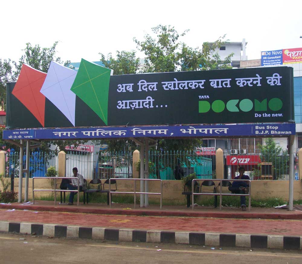 A Docomo hoarding using bus shelter to attract eyeballs. Bus shelter is an excellent medium of local advertising. Location is its prime advantage. High footfalls offer a good publicity to the revered services and products.