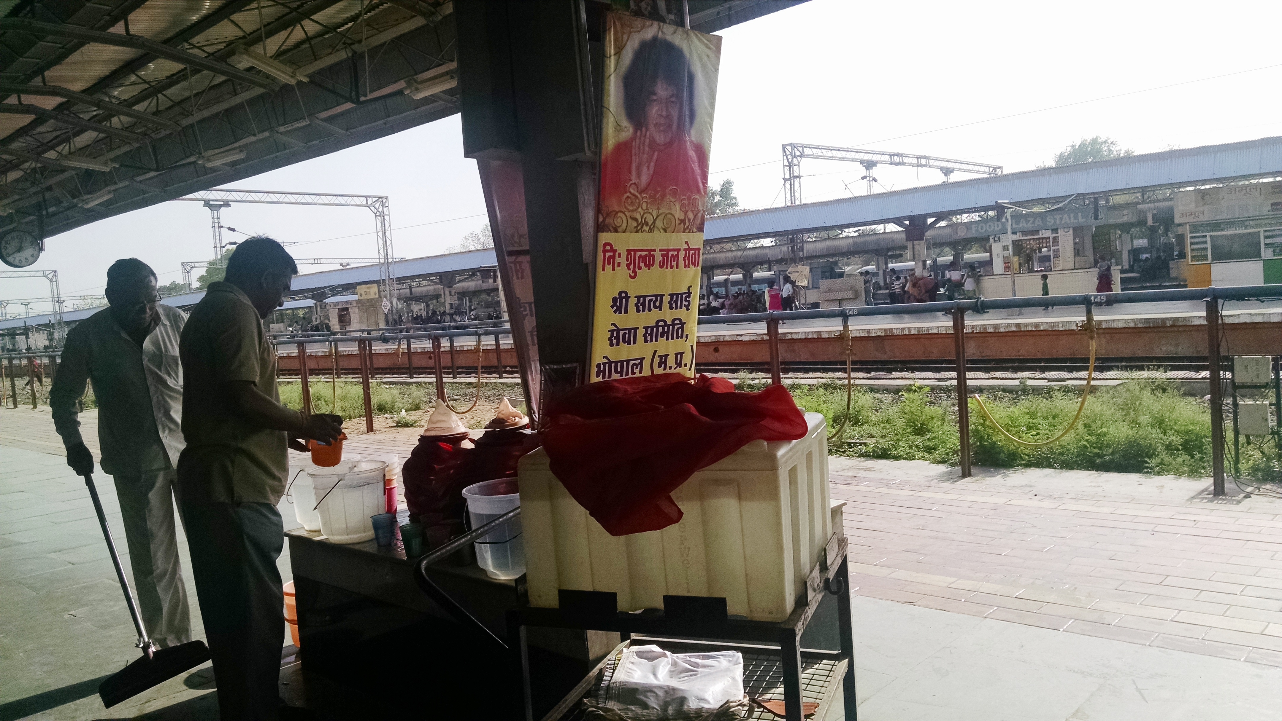 People drinking water at station. A small banner for 'free drinking water' to promote the Sri Satya Sai Seva Organisation in Bhopal.